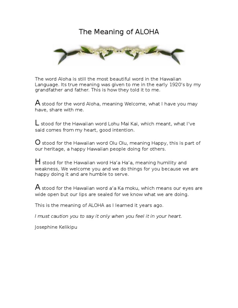 It's a lifestyle of love, compassion and recognition. Wai can also refer to any kind of liquid that's not seawater, which is called kai. According to care.com , common examples include keoni (john), kiana (diana), and kimo (for james). For macron usage, replace the underline below a letter with a macron over the same letter. For hawaiians, aloha is not just a way to say hello and goodbye;
